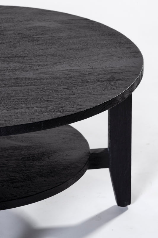 The Norveau Coffee Table, made from solid mango wood in black. Simple round design, with four tapered legs and wooden shelf.