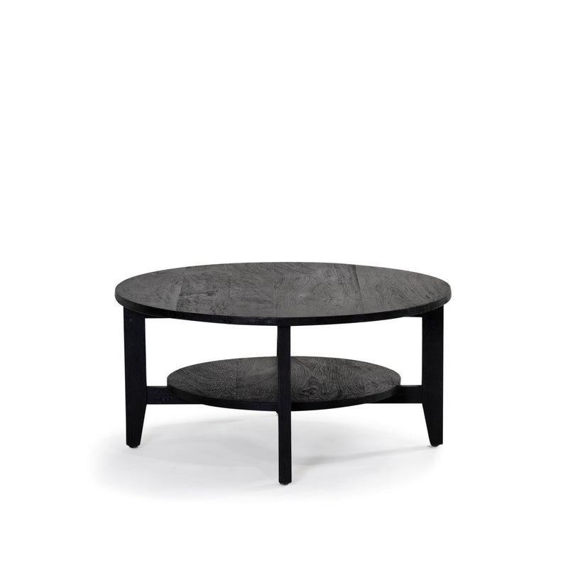 The Norveau Coffee Table, made from solid mango wood in black. Simple round design, with four tapered legs and wooden shelf.