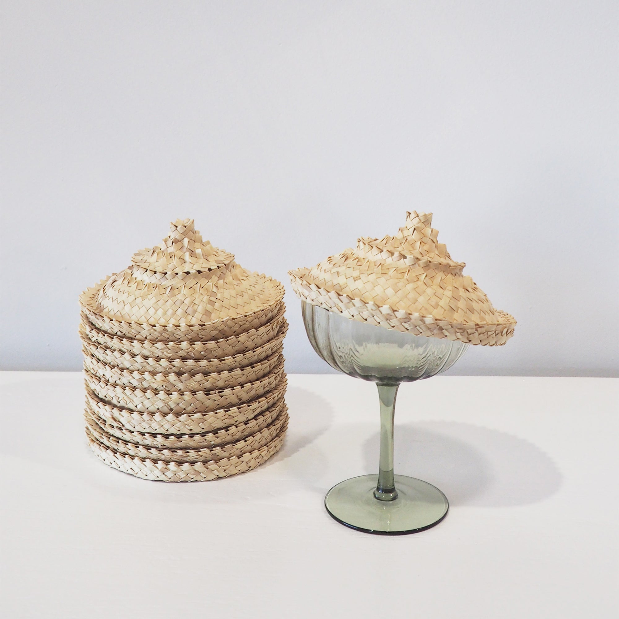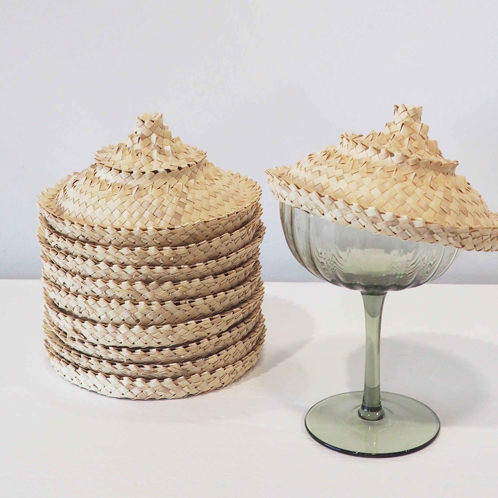 Handwoven from natural rattan, this rattan glass hat rests neatly atop your drink. Keep insects and dust at bay while adding a touch of texture and warmth to your table setting.