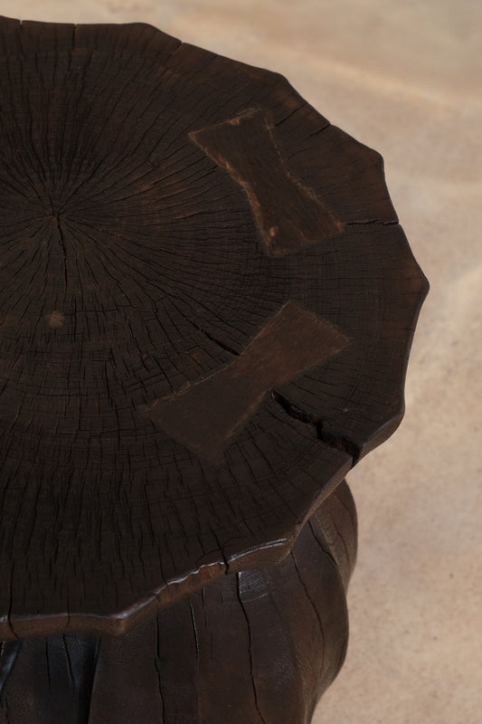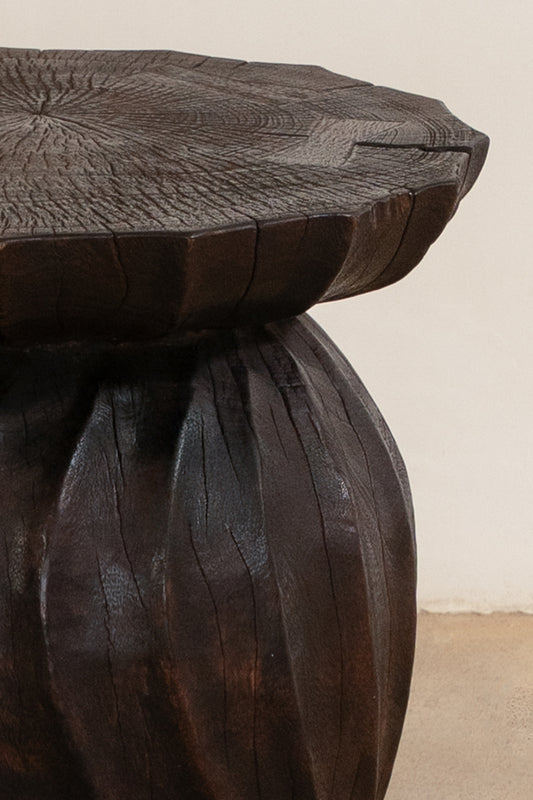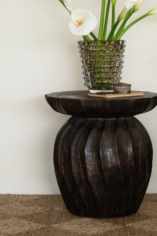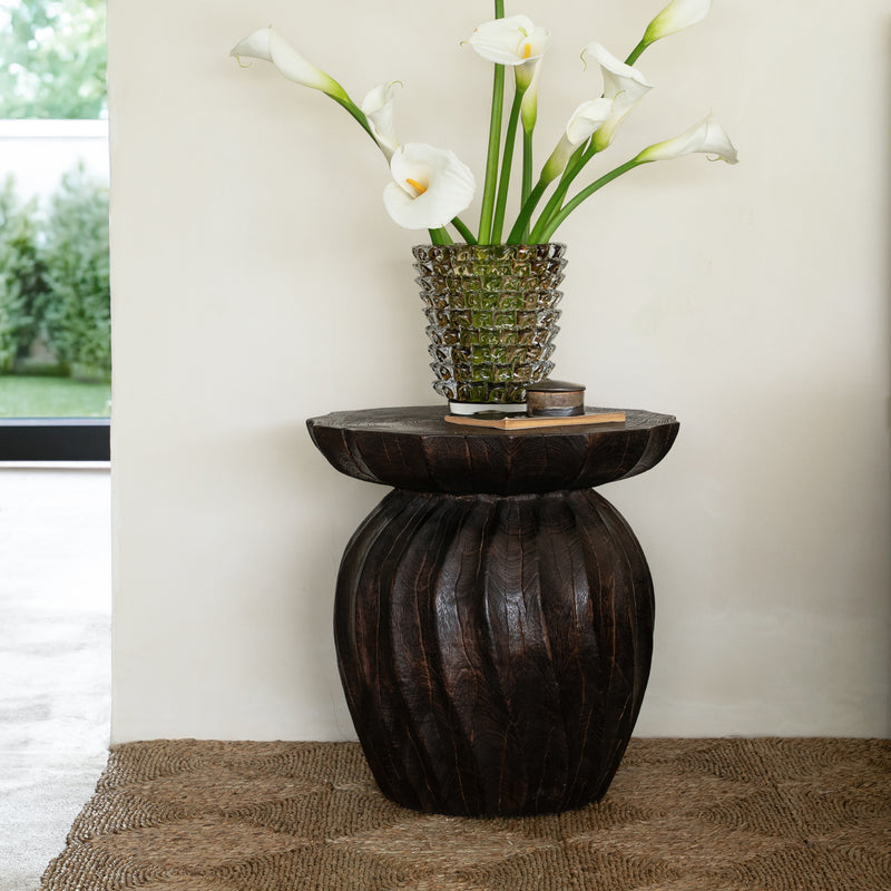 Crafted from mango wood with a sculptural, curved silhouette and a smooth round top. The carved texture and dark-stained finish highlight the natural grain and form of the timber, making each piece unique. Colours and finishes between items may vary slightly due to the natural nature of the wood.