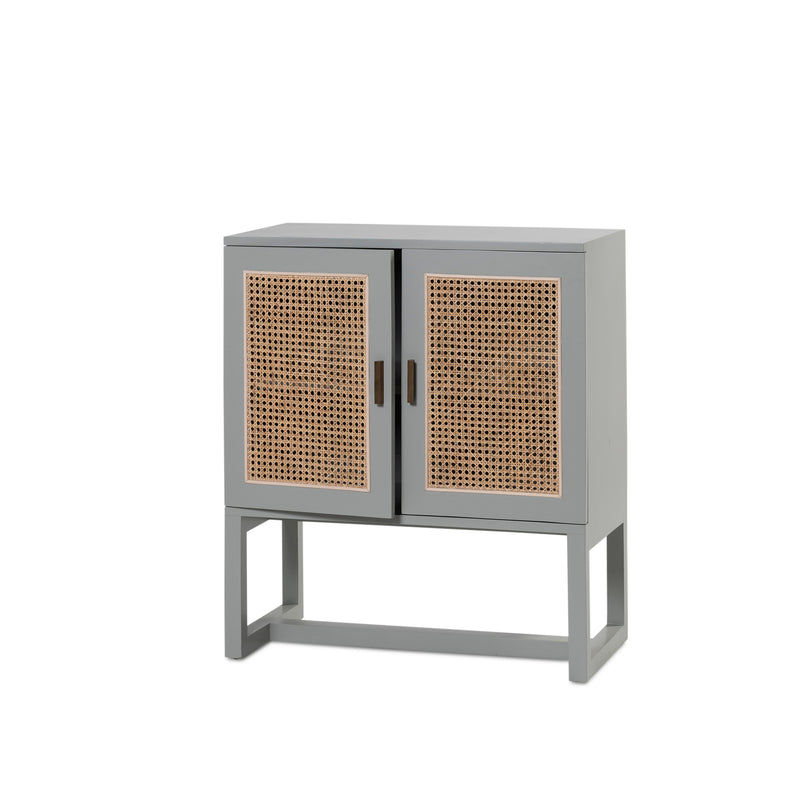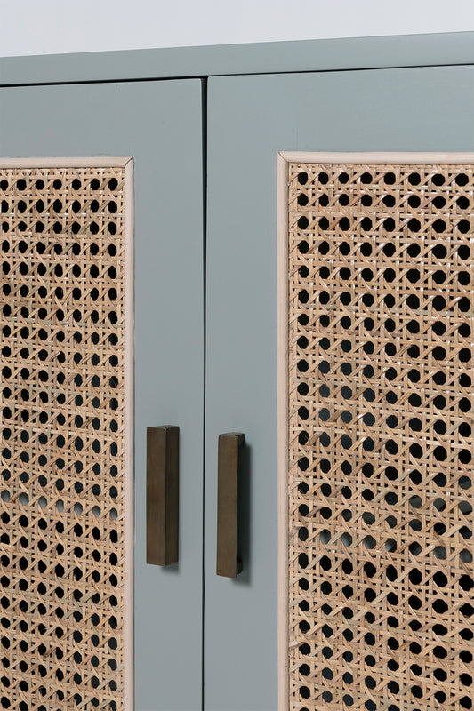 The Rita Buffet, built from mango wood in sage finish. Featuring two doors with natural rattan inserts and solid brass handles.
