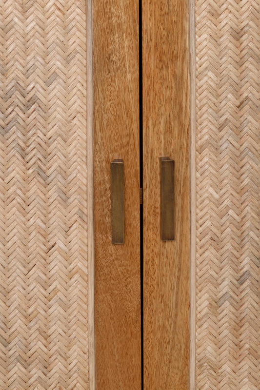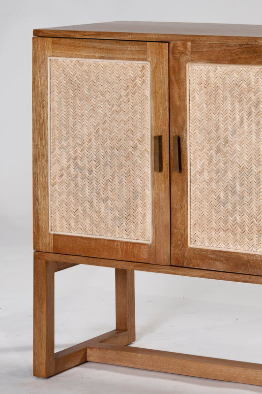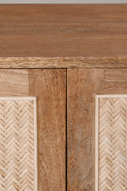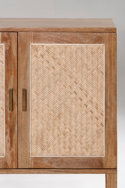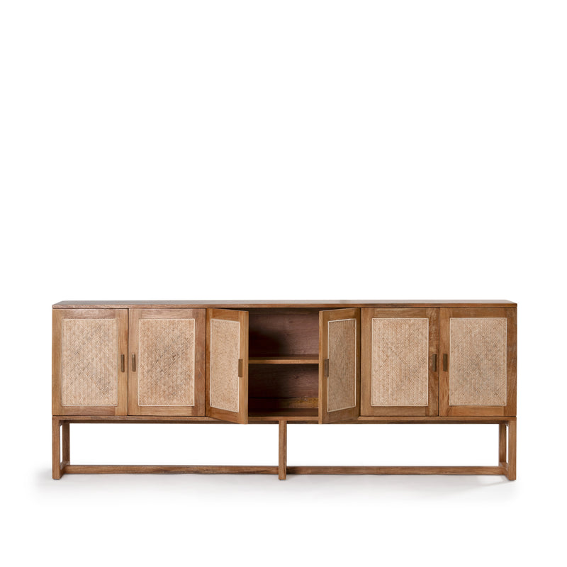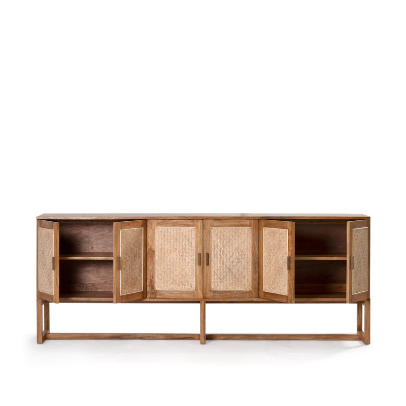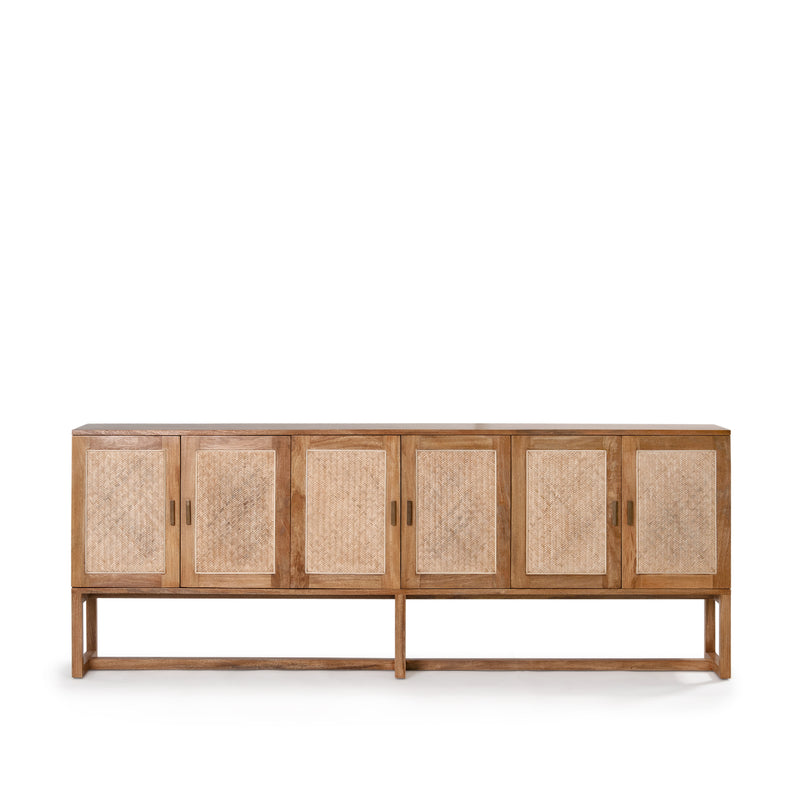 The Rita Buffet, built from mango wood in natural sealed finish. Featuring six doors with natural rattan inserts and solid brass handles.