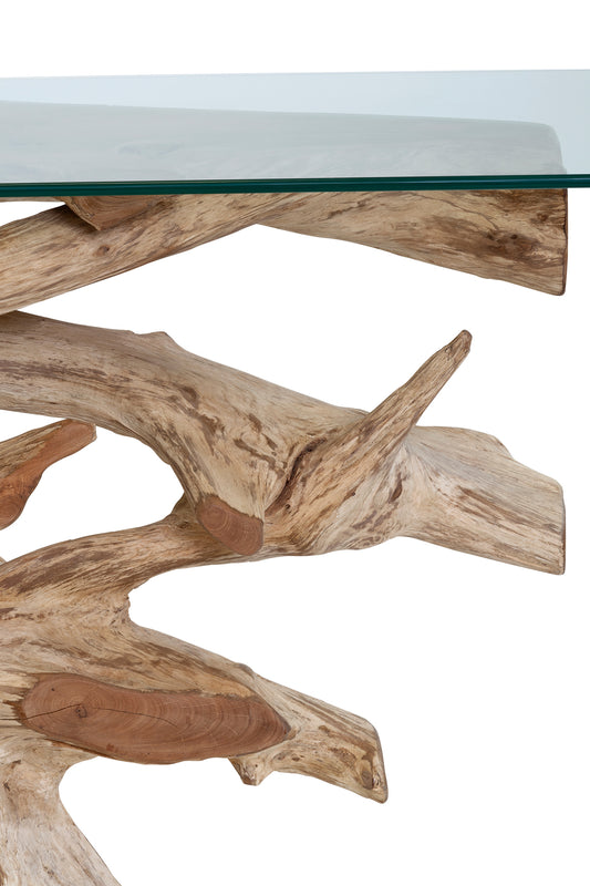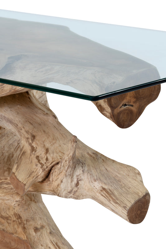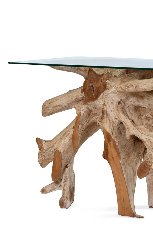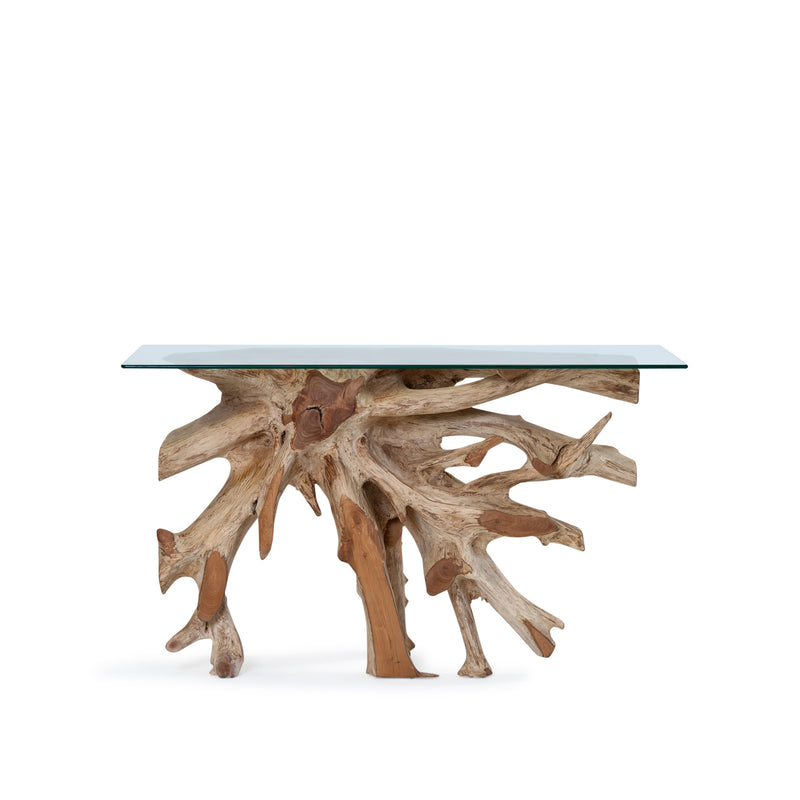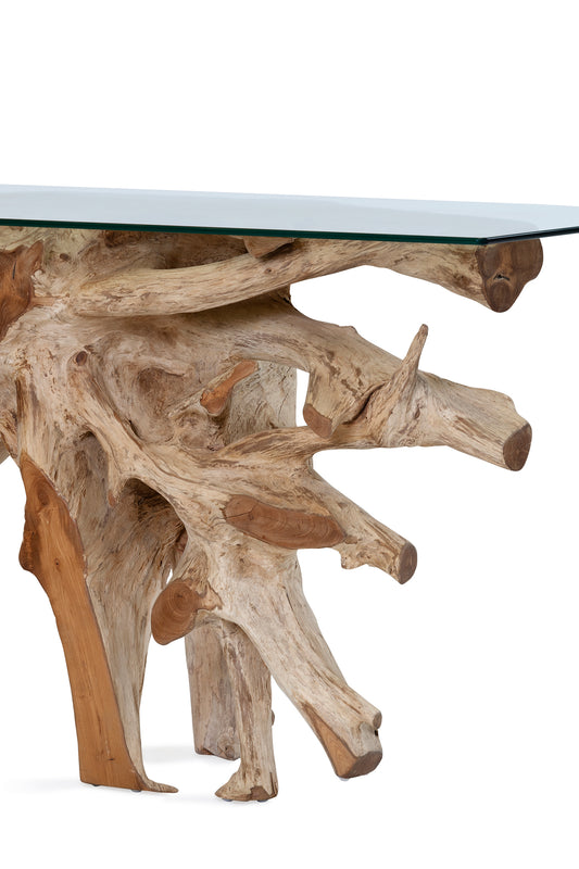 Unique console made from raw organic teak with rustic, root shape. The tabletop is made from strong tempered glass.