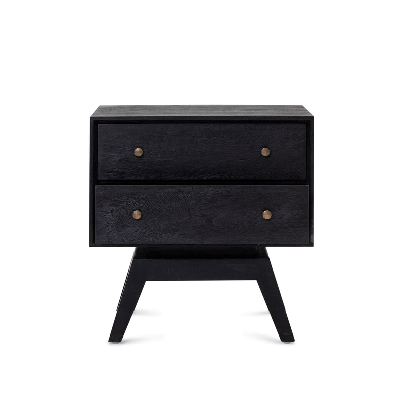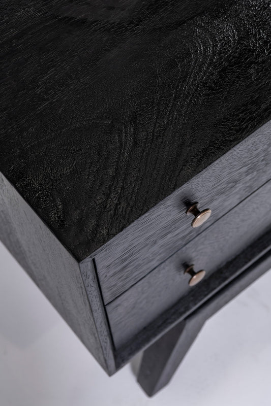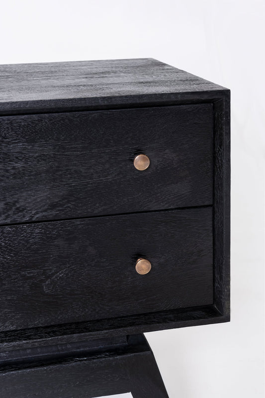 The Sari Bedside, made from mango wood in black finish featuring two sliding drawers with solid brass handles.