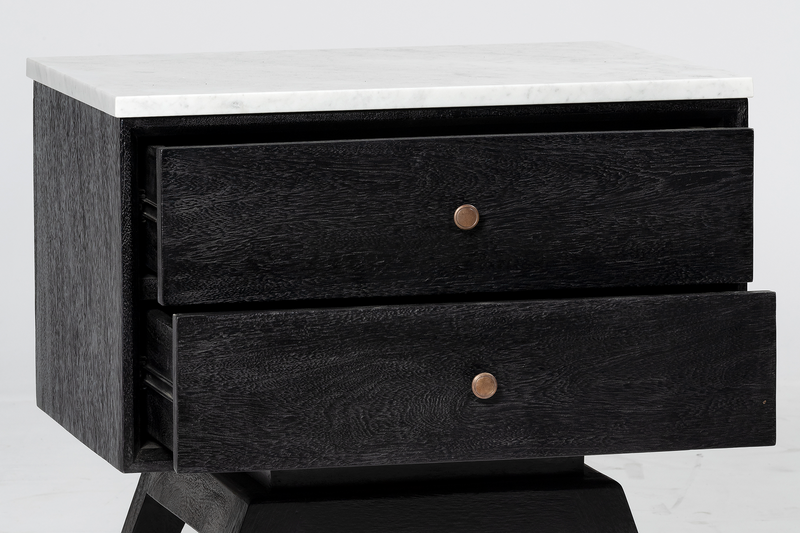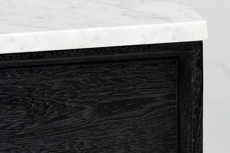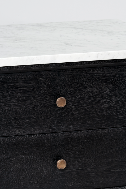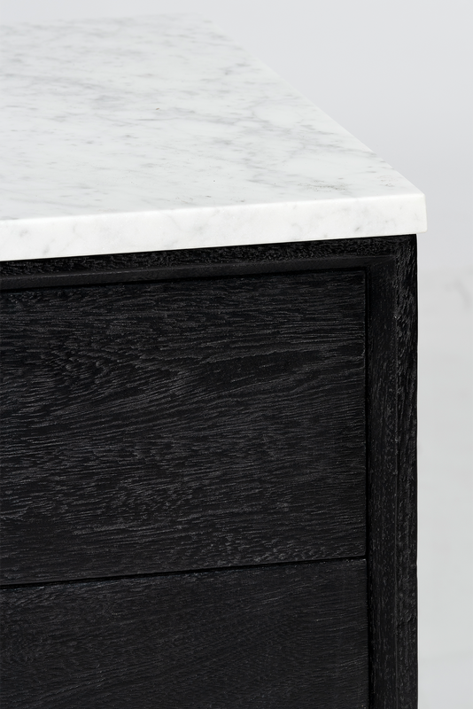 Made from mango wood in black finish and solid Carrara white marble top. Two large sliding drawers with solid brass handles.
