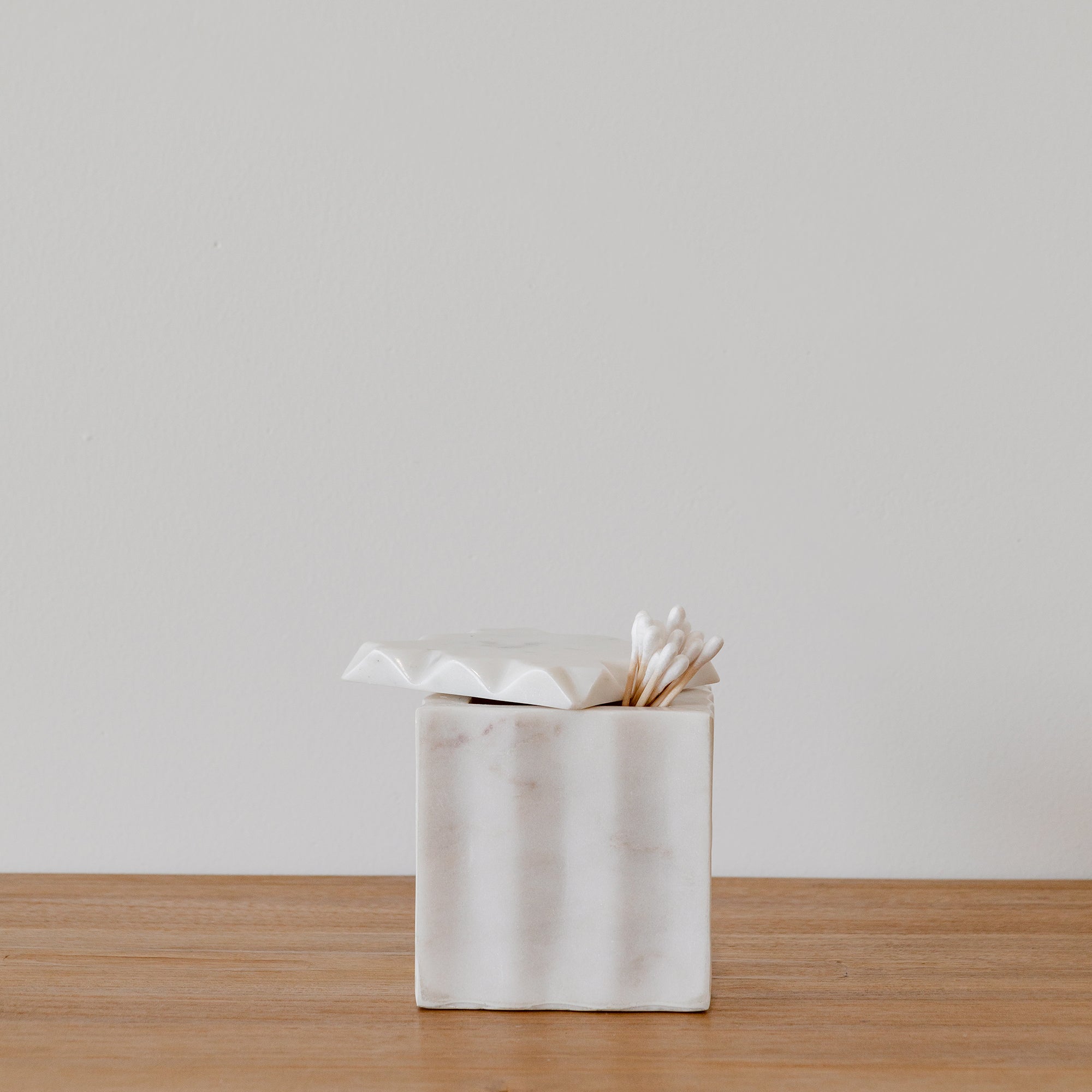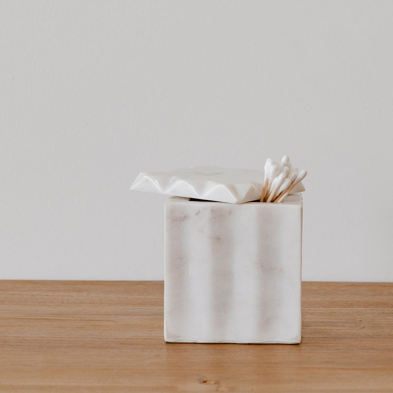 Made from luxurious white marble, this is the perfect canister to hide away small items and essentials. Its elegant design not only enhances any space, but its practical functionality makes it the perfect addition to your vanity or bedroom.