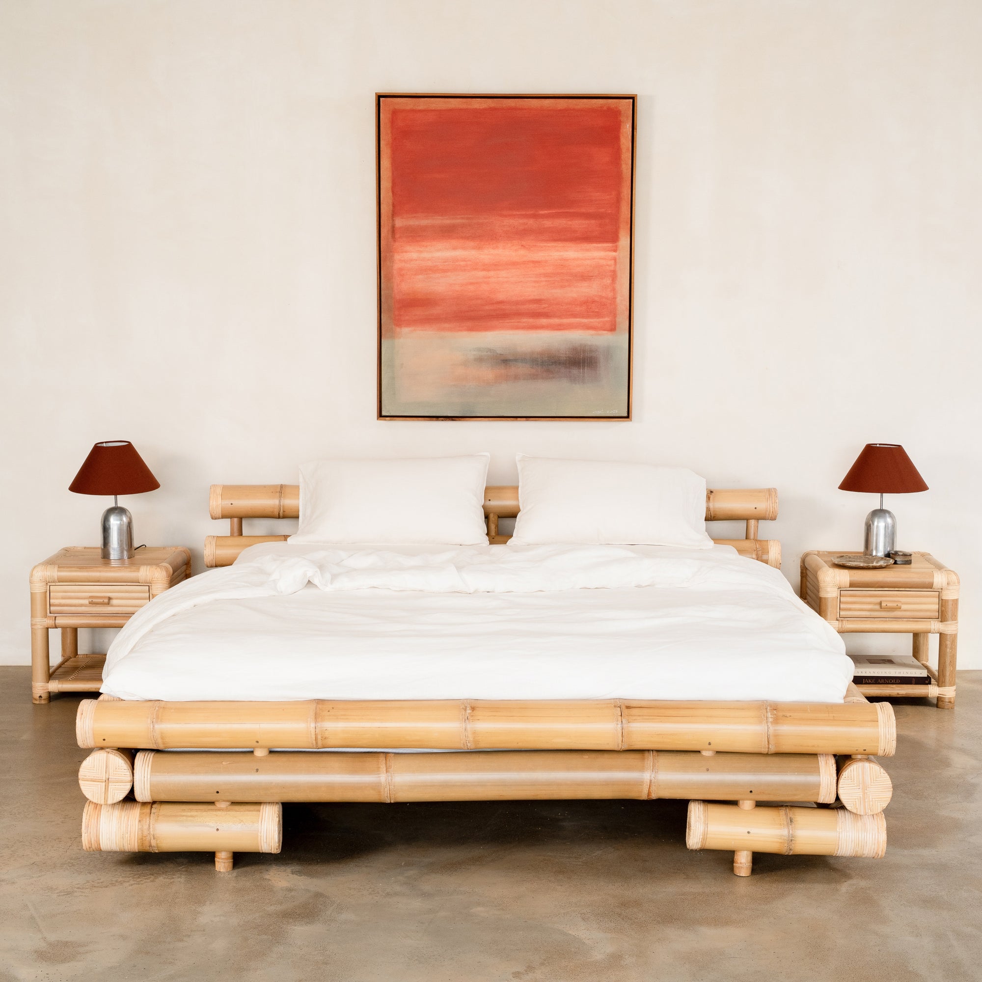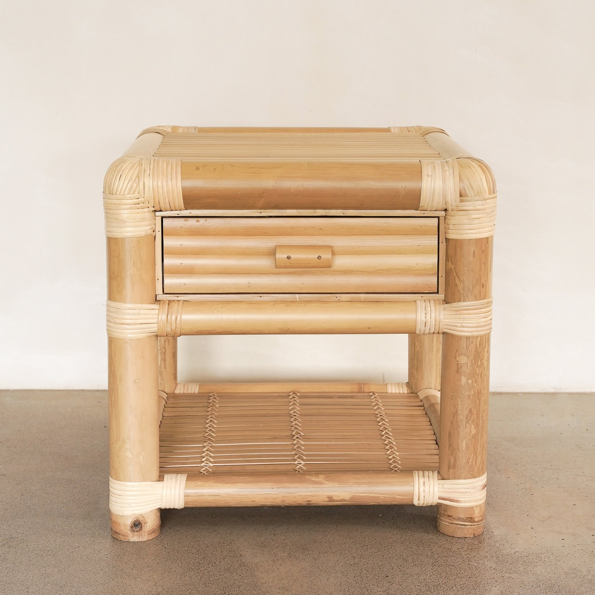 A streamlined bamboo bedside that combines function with quiet luxury. The drawer and open shelf offer practical storage, while the natural finish brings relaxed sophistication to the bedroom.