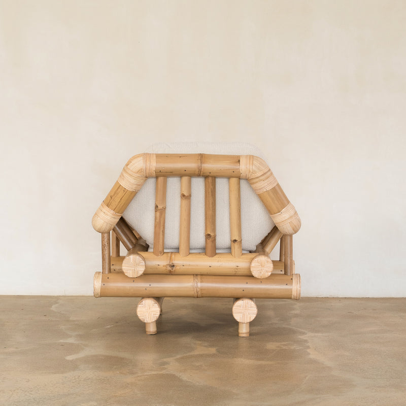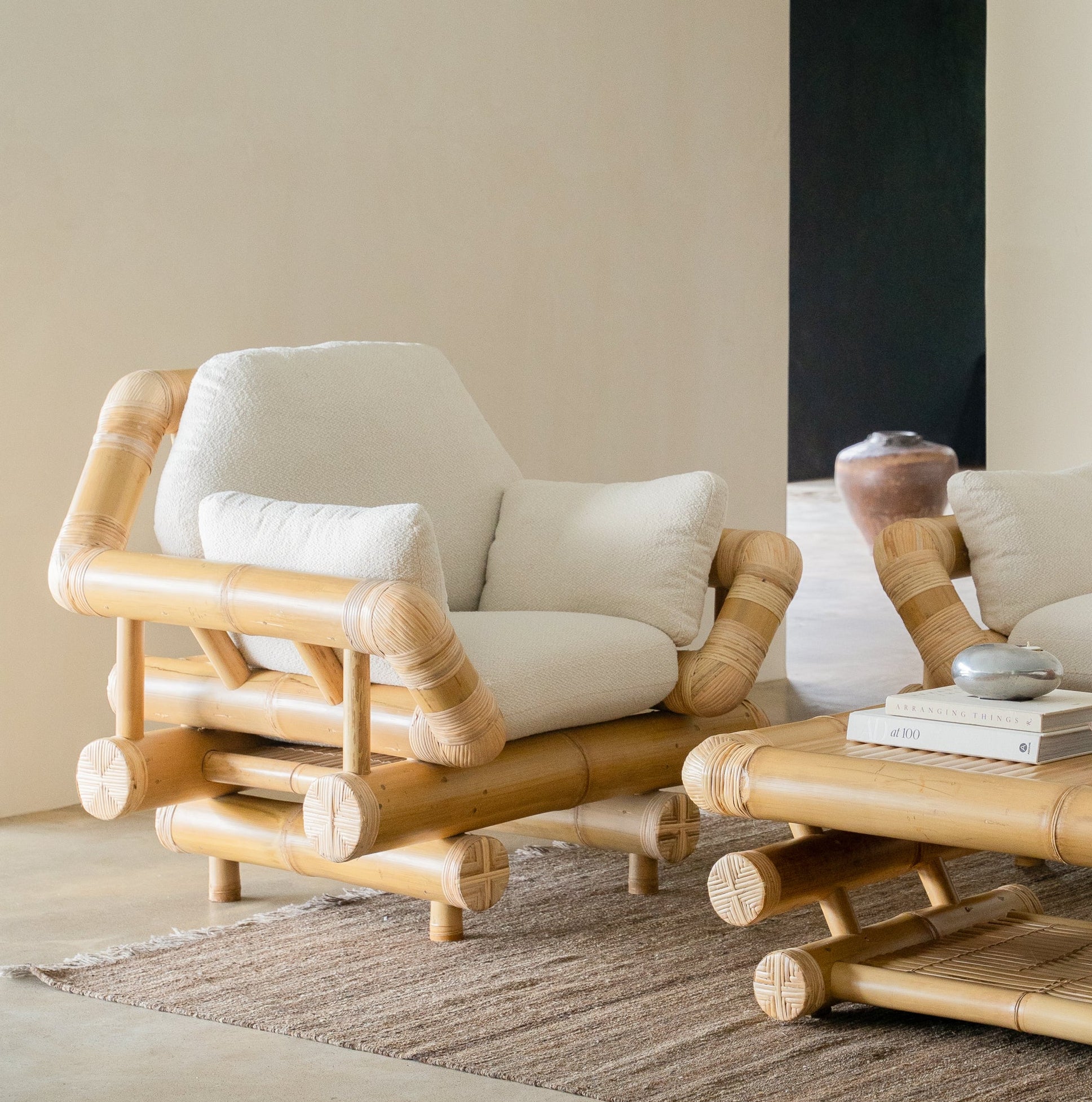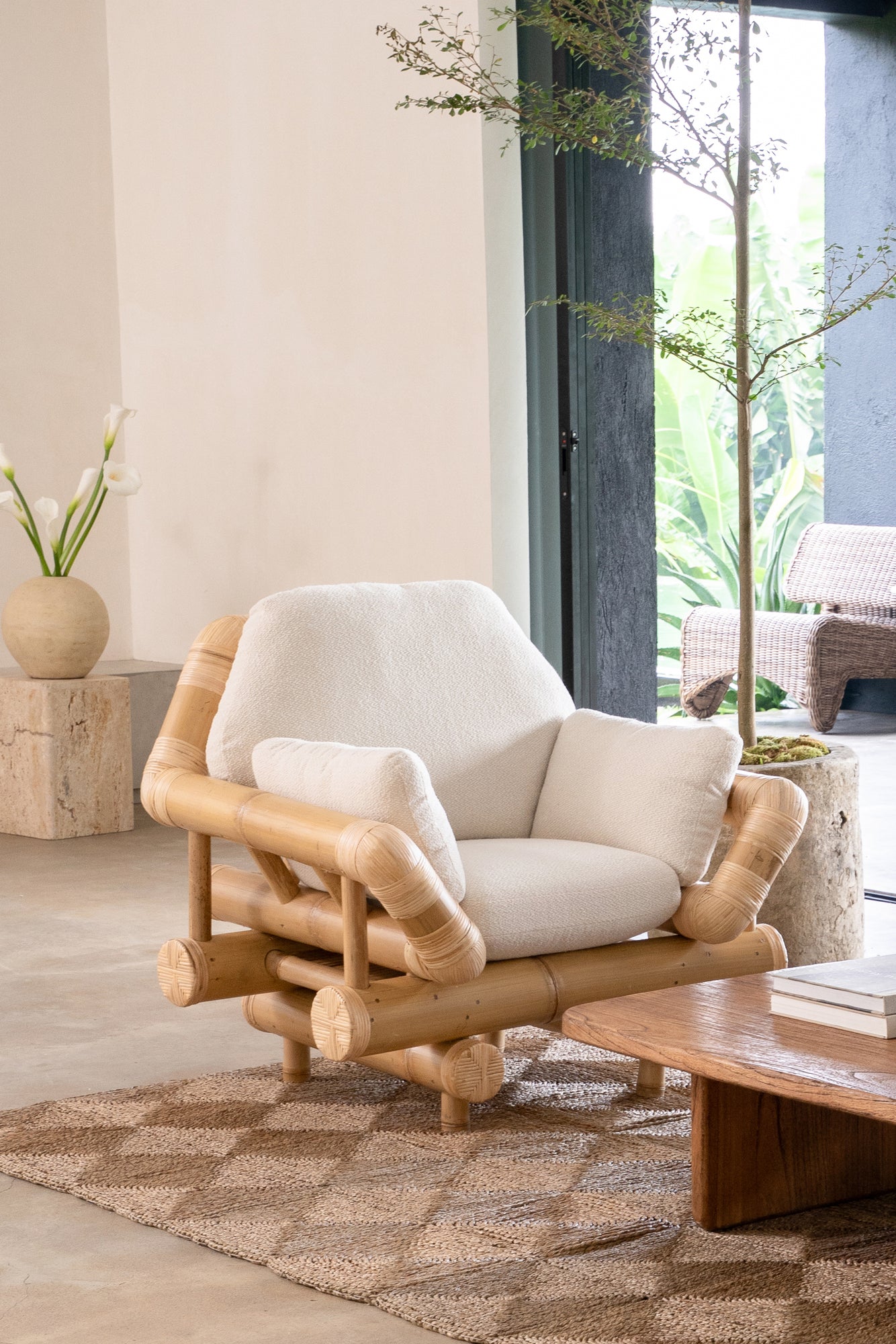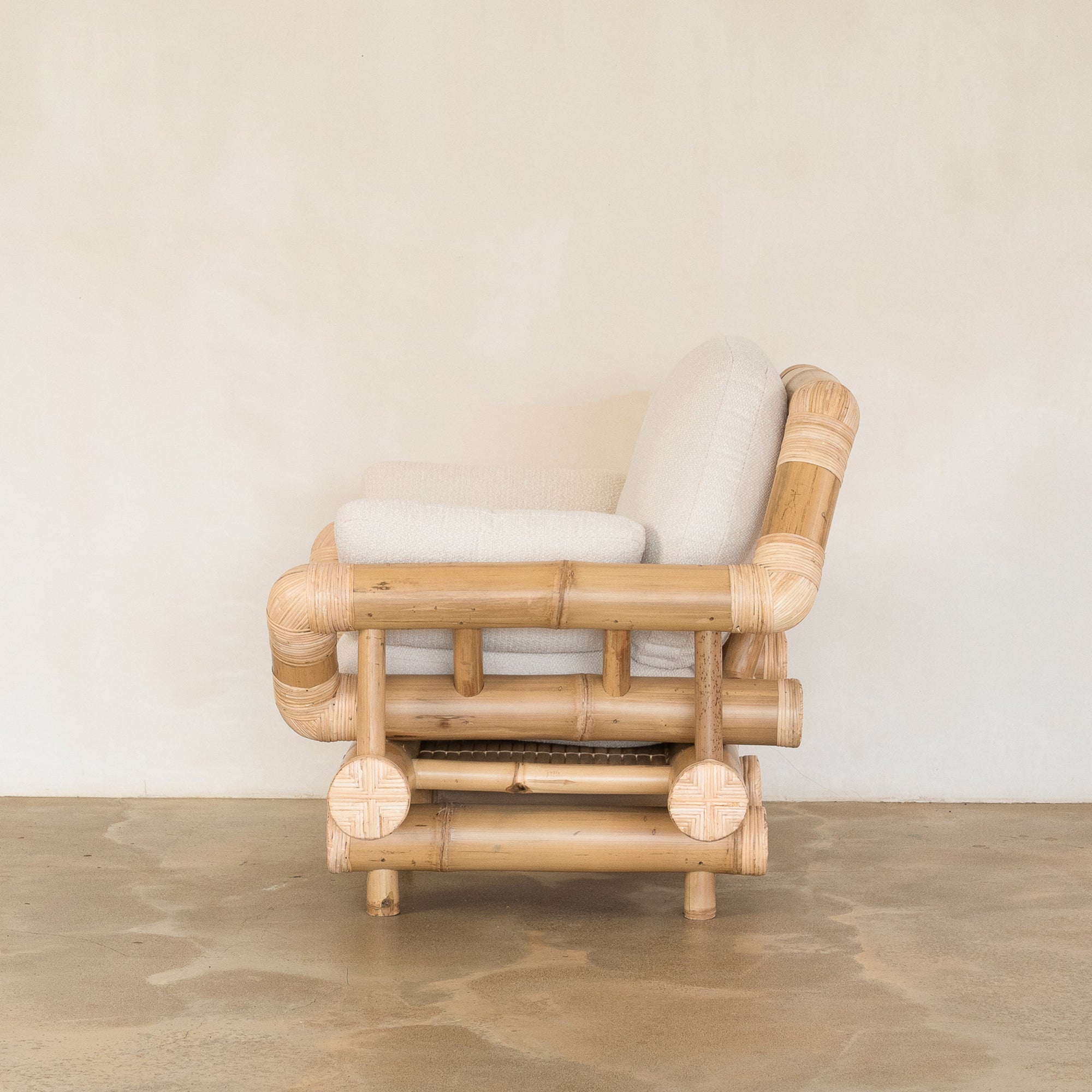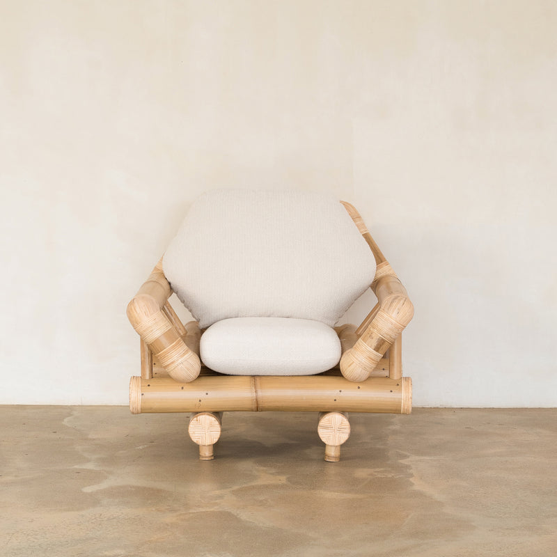 A sculptural occasional chair crafted from natural bamboo. Comfortable and textural, it works beautifully as a standalone accent or alongside the Studio Bamboo Sofa.