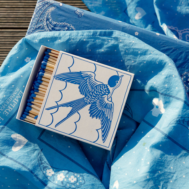 A timeless addition to the home, the Swallow Matchbox features a graceful blue swallow in flight, letterpress printed with artisanal care. Designed to bring both beauty and function, each box holds 125 long matchsticks — perfect for lighting candles, fireplaces, or simply adding character to a coffee table or mantel.