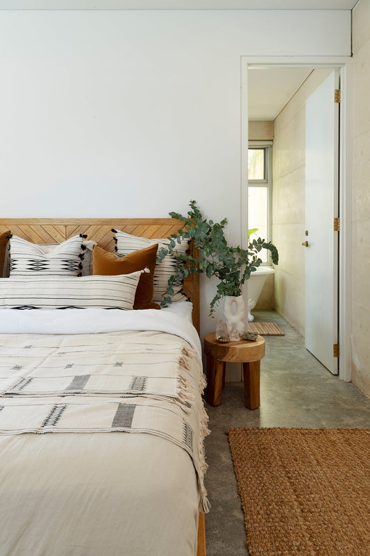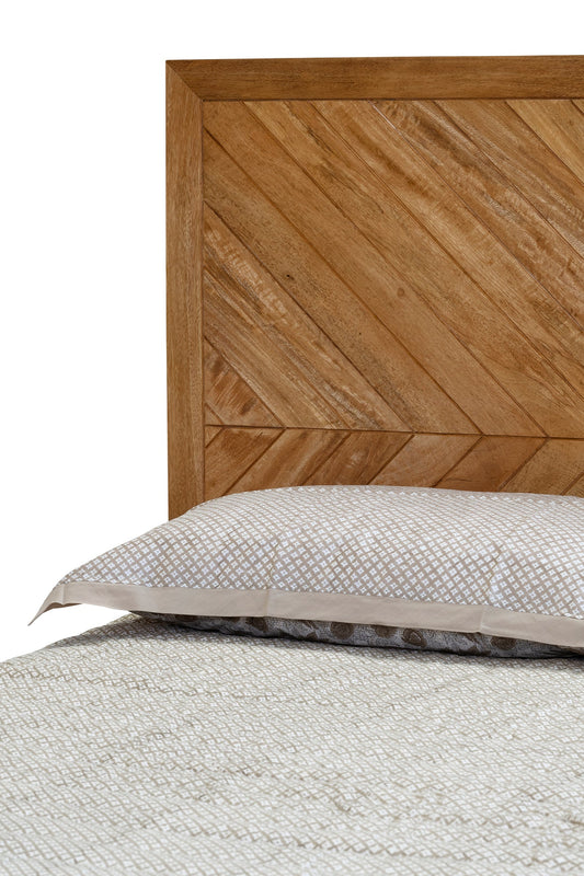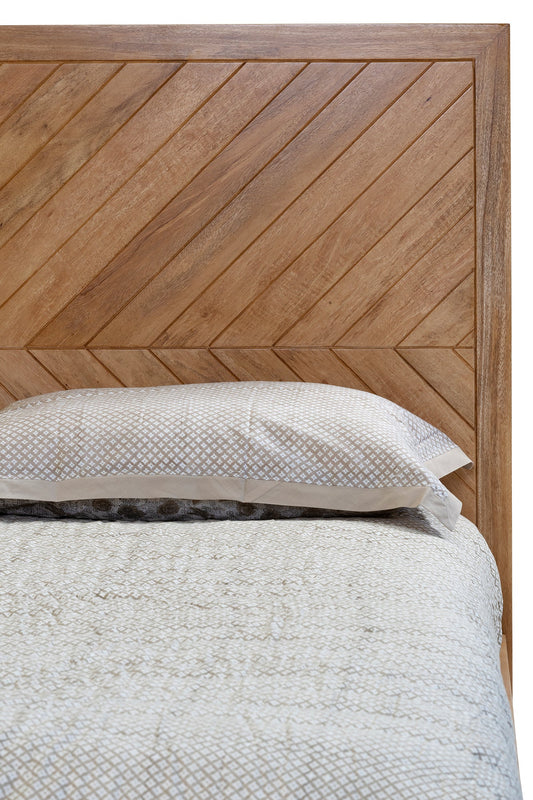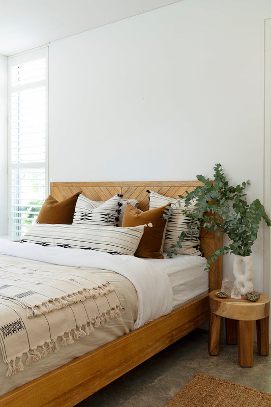 The Tapestry Bed in Rustic Matte is defined by its distinctive parquetry headboard, where geometric timber panels highlight the natural grain and tonal variation of solid mindi. A sculpted frame, gently angled footboard and tapered legs create a balanced, architectural silhouette. Soft and understated in finish, the Tapestry Bed in Rustic Matte brings warmth and quiet structure to the bedroom.