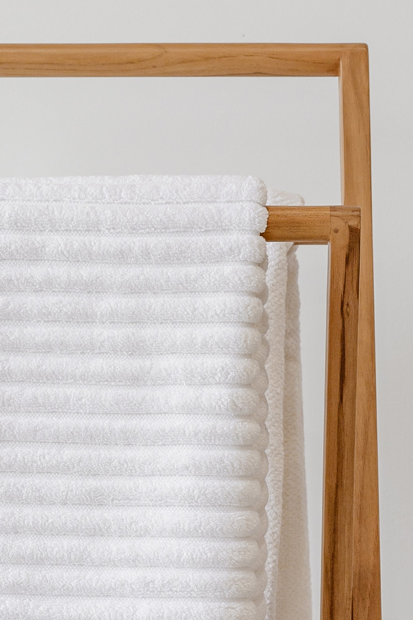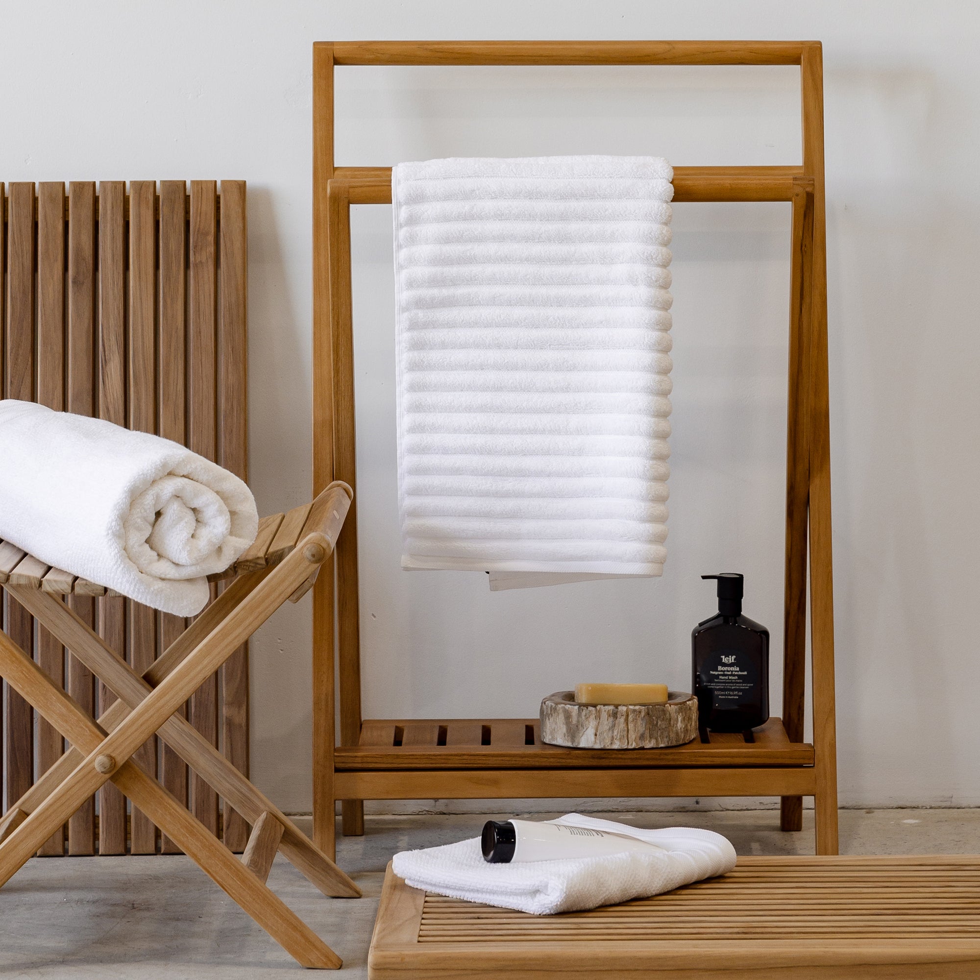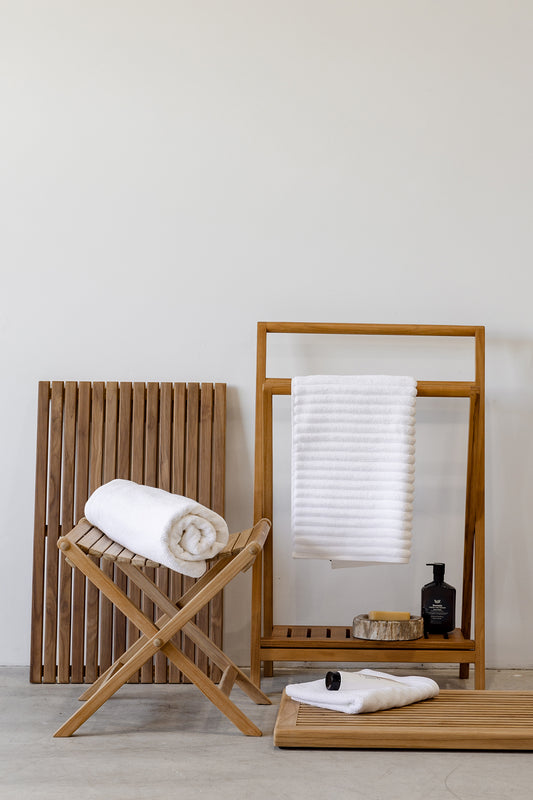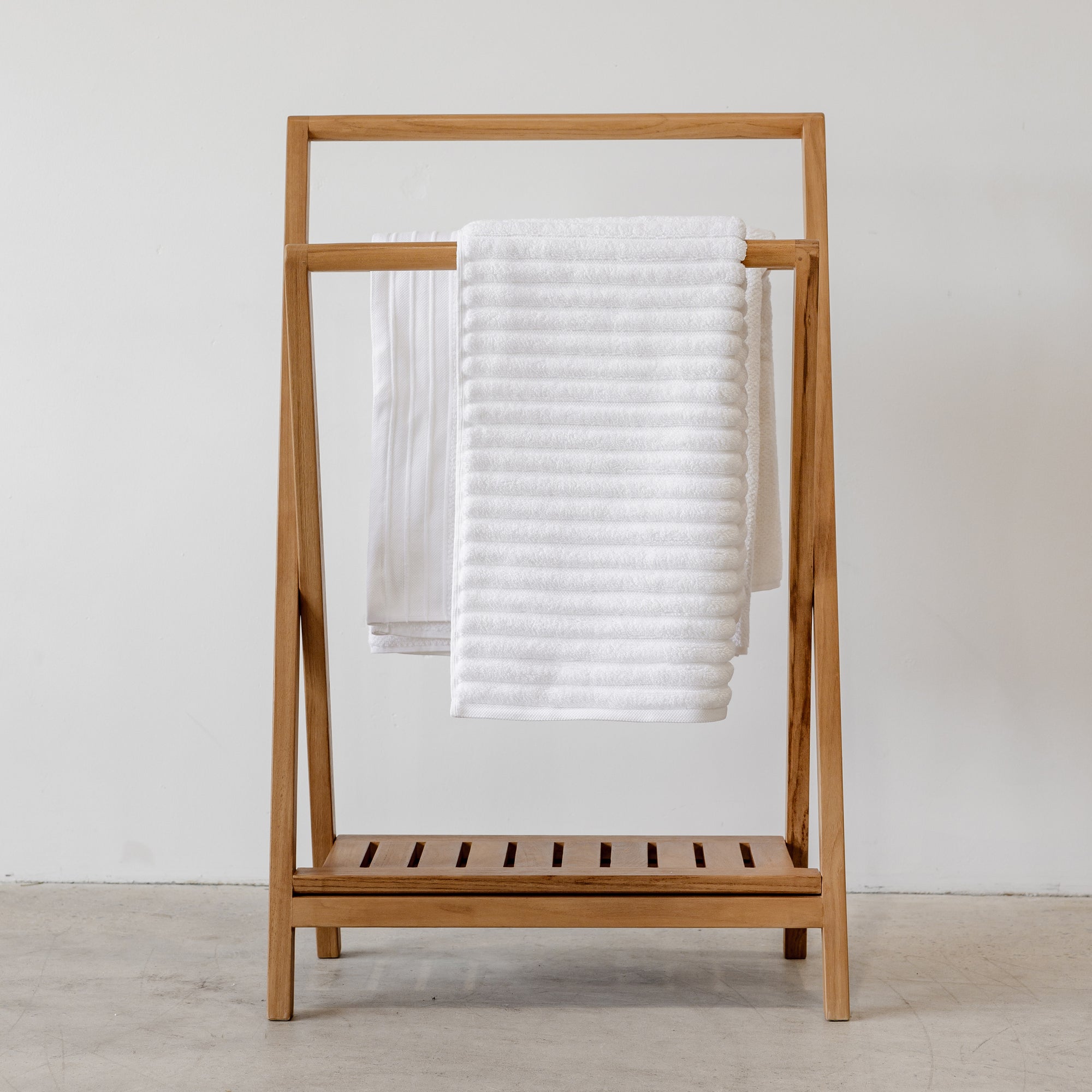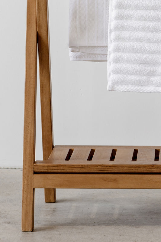 Crafted from durable teak hardwood in a natural raw finish, the Teak Atelier Folding Towel Rack offers a refined storage solution for the bathroom. The classic folding frame features dual hanging rails and a slatted lower shelf, providing practical towel storage with a clean, minimalist profile. Naturally water-resistant, teak is ideal for humid environments, making this piece both functional and timeless.