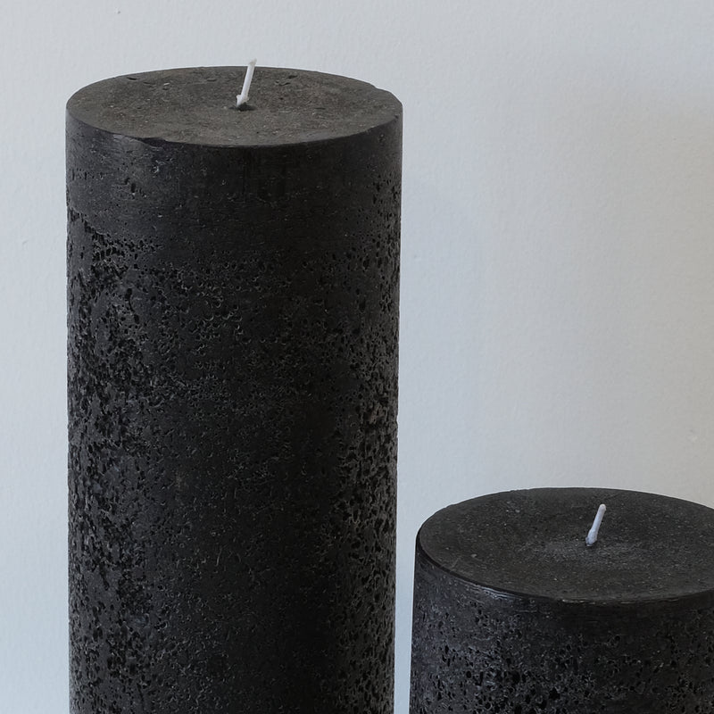 Deeply textured pillar candle in a bold black finish. A striking accent for modern, moody settings.