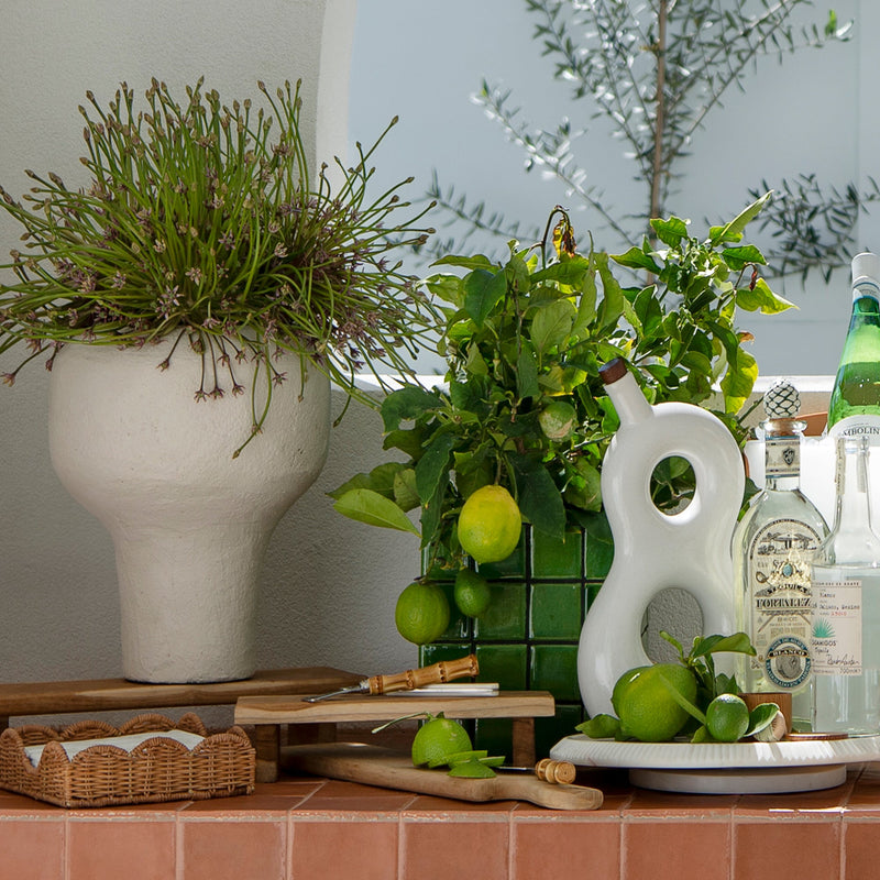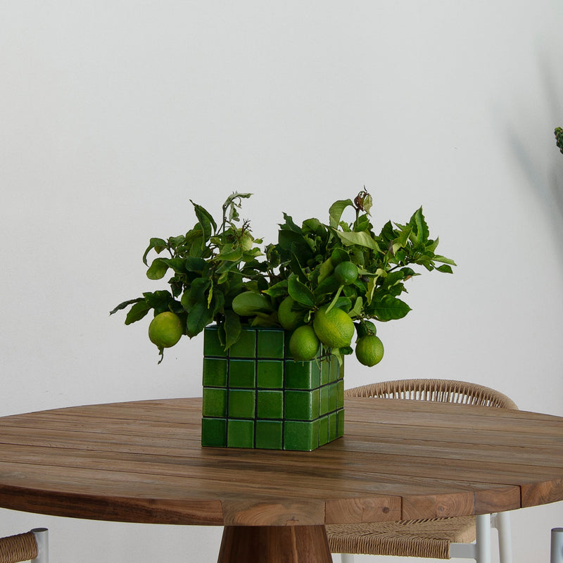 Stunning vase featuring handmade vibrant green ceramic tiles with a glossy powder coated iron pot.