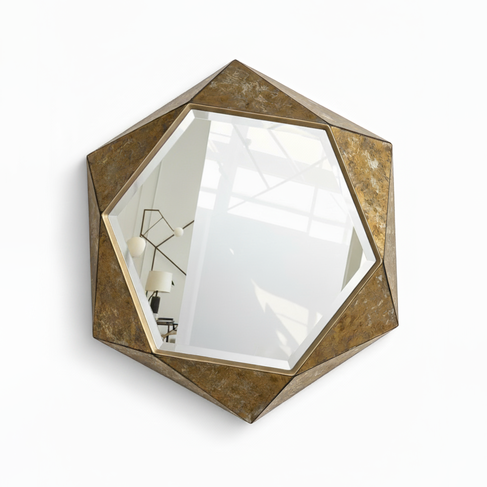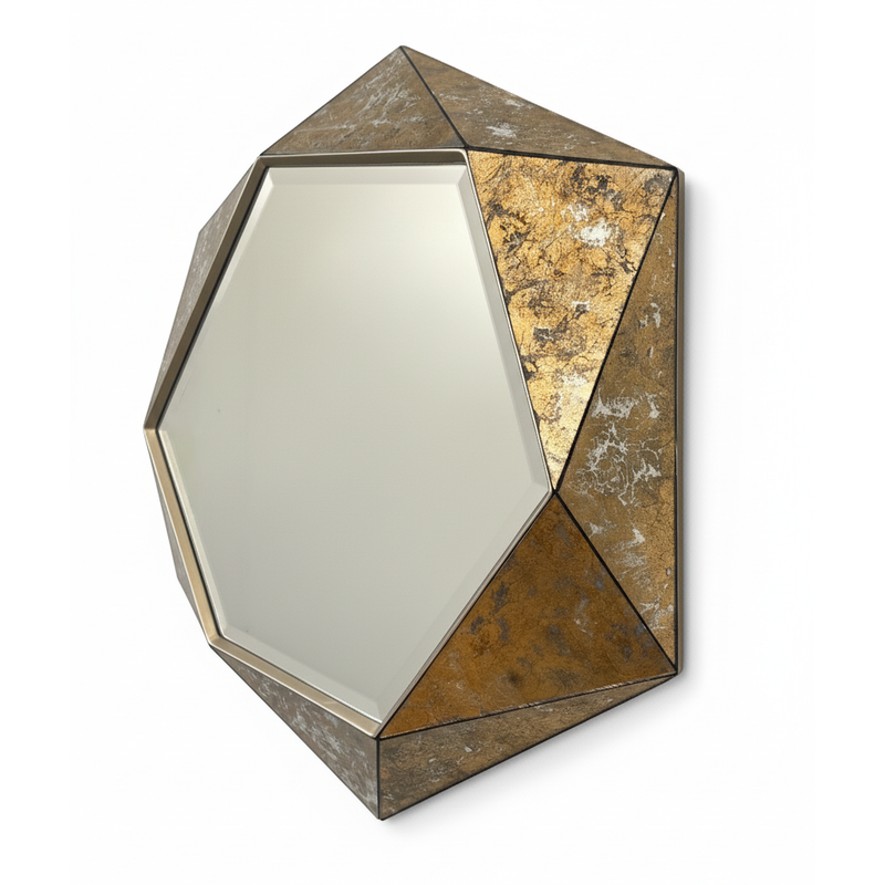 The Versailles Marie Mirror captures a sense of sculptural elegance and timeless luxury. Its faceted, geometric frame in a burnished antique finish reflects light from every angle, creating depth and dimension. With a soft metallic patina and mirrored bevel detailing, this statement piece adds refined character to any living or entry space.