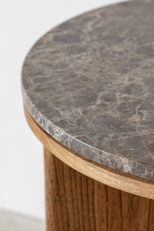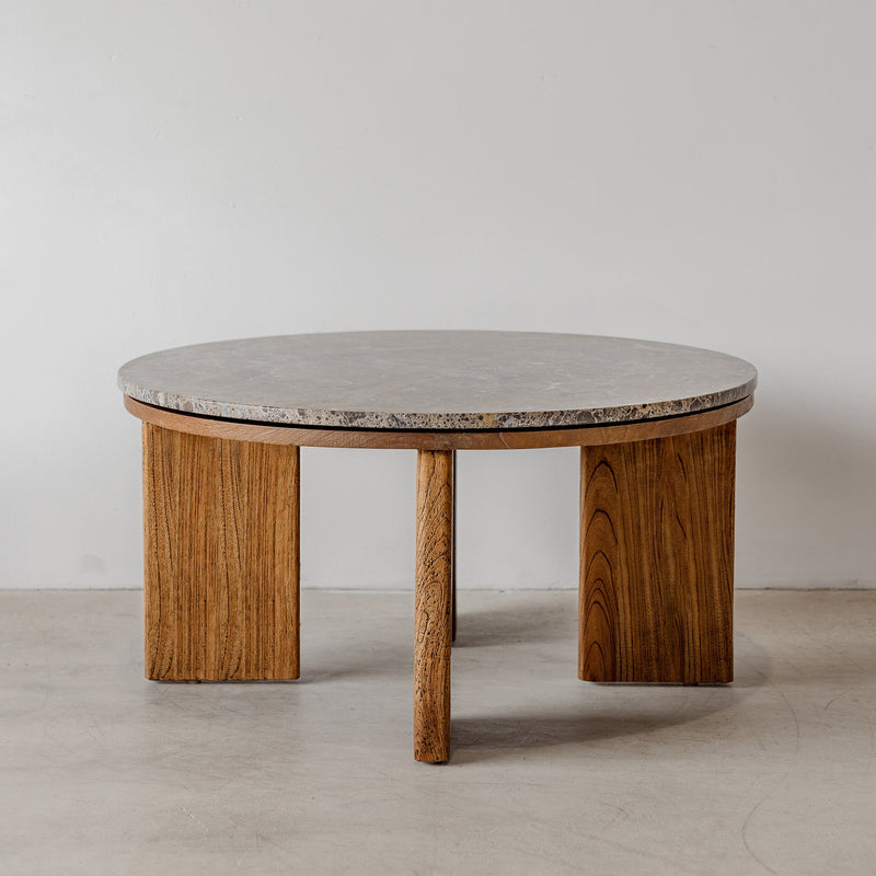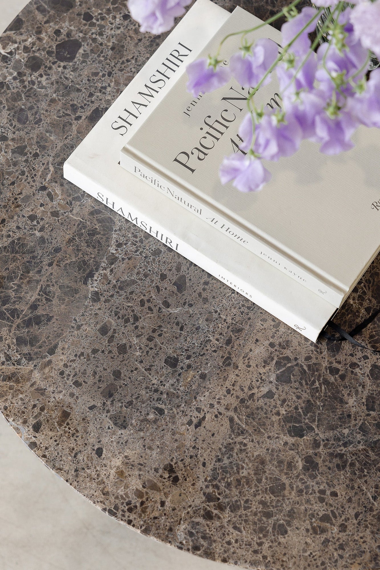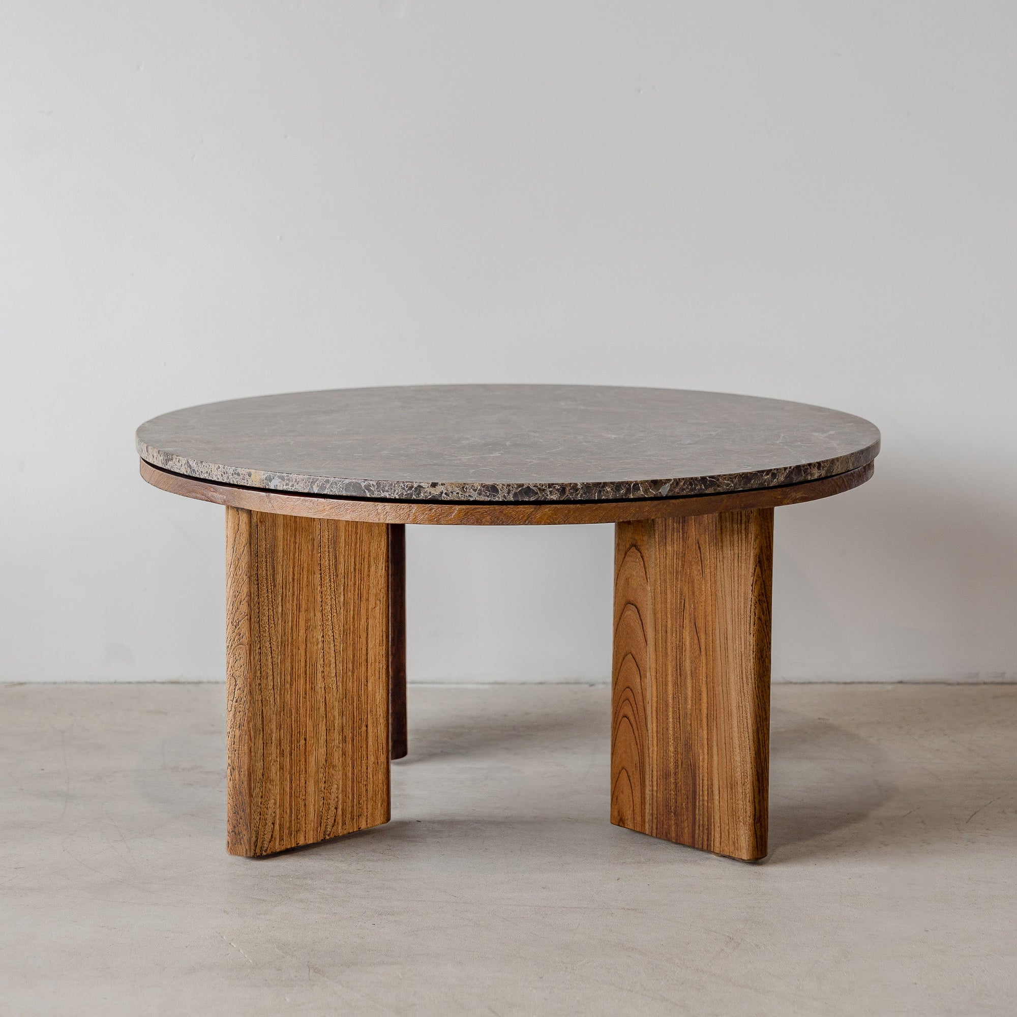 The West Coffee Table in Antique Mindi with Choc Marble Top is a refined balance of form, function and versatility. Crafted from solid timber, its circular marble top rests on four architecturally angled legs. Designed to be rotated, the table reveals different silhouettes, allowing the piece to subtly shift in character depending on its orientation.