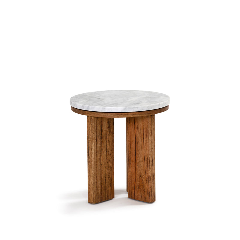 The West Side Table, constructed in sustainable mindi wood with antique finish and Carrara white marble top. Featuring unique angled leg design.