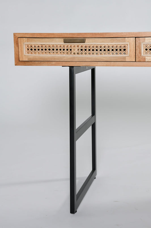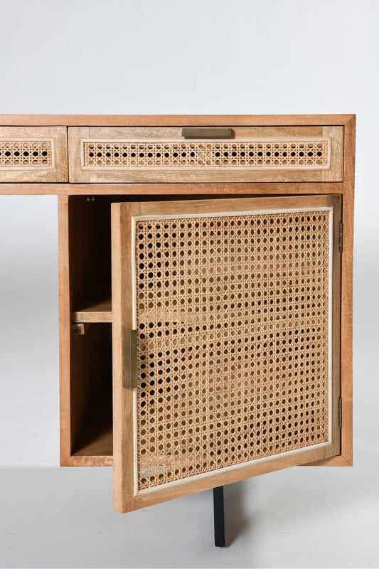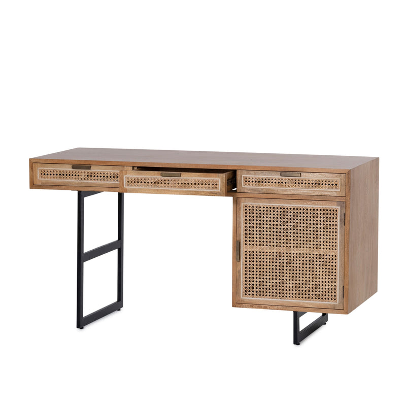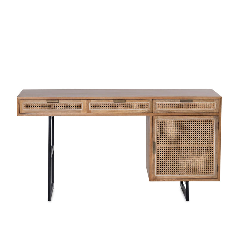 The Willow Desk is built from solid mango wood in natural sealed finish with natural rattan inserts and black iron frame legs. Features three drawers and one cupboard for extra storage and finished with solid brass handles.