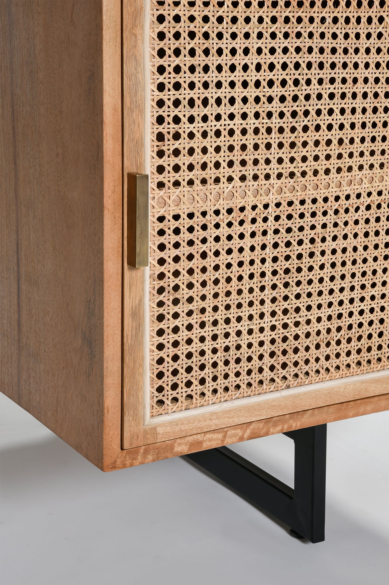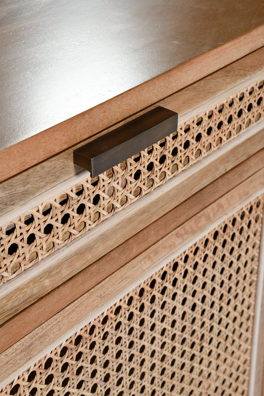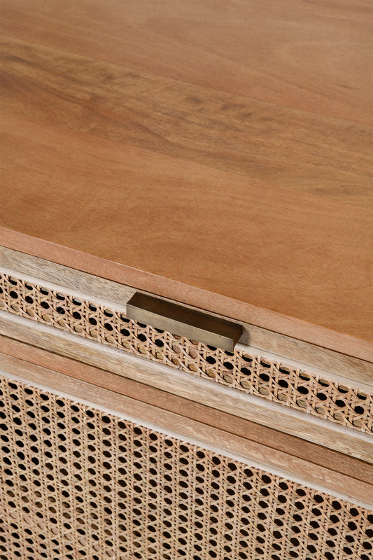 - Mango wood natural sealed finish with natural rattan inserts, brass handles